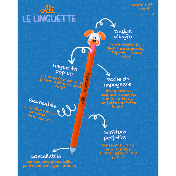 Olli Le Linguette è la penna divertente e funzionale che unisce praticità e design allegro. Con la simpatica testa a forma di cagnolino, disponibile in vari colori, rende la scrittura più piacevole e originale.